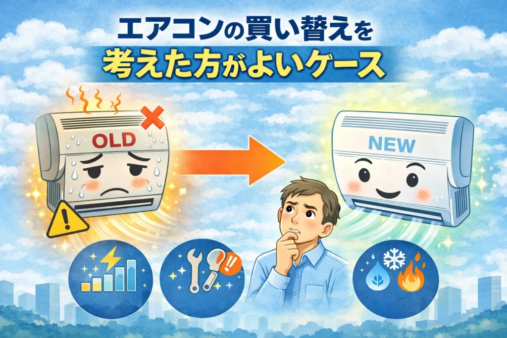一方で、年式が古くなり、効きの低下や不具合、電気代の負担が気になってきた場合は、買い替えを考えた方が納得しやすいこともあります。