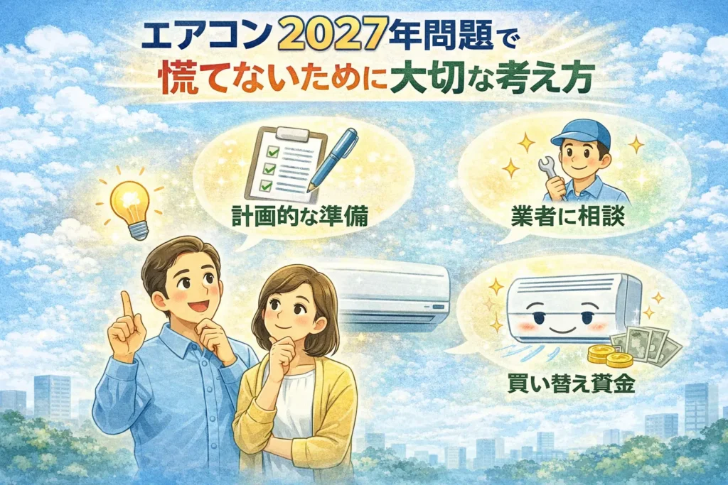 このように整理しておけば、「エアコン2027年問題」という言葉に振り回されず、自分に合ったタイミングで冷静に判断しやすくなります。